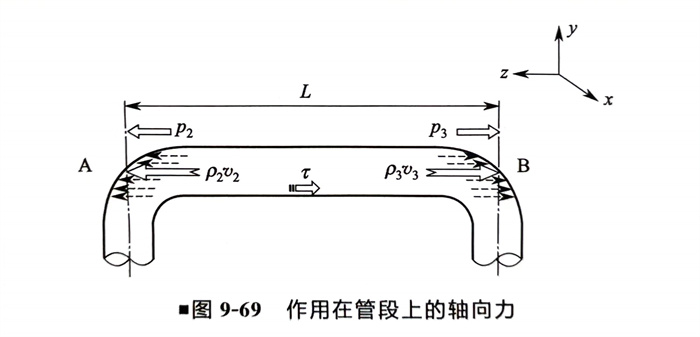 在(zai)(zai)計(ji)算中,假設介質是在(zai)(zai)固定住的管(guan)道中流動(v1),不考慮管(guan)道本身振動的影響(xiang),作用在(zai)(zai)管(guan)道上的流體載荷計(ji)算見圖9-69所(suo)示:
