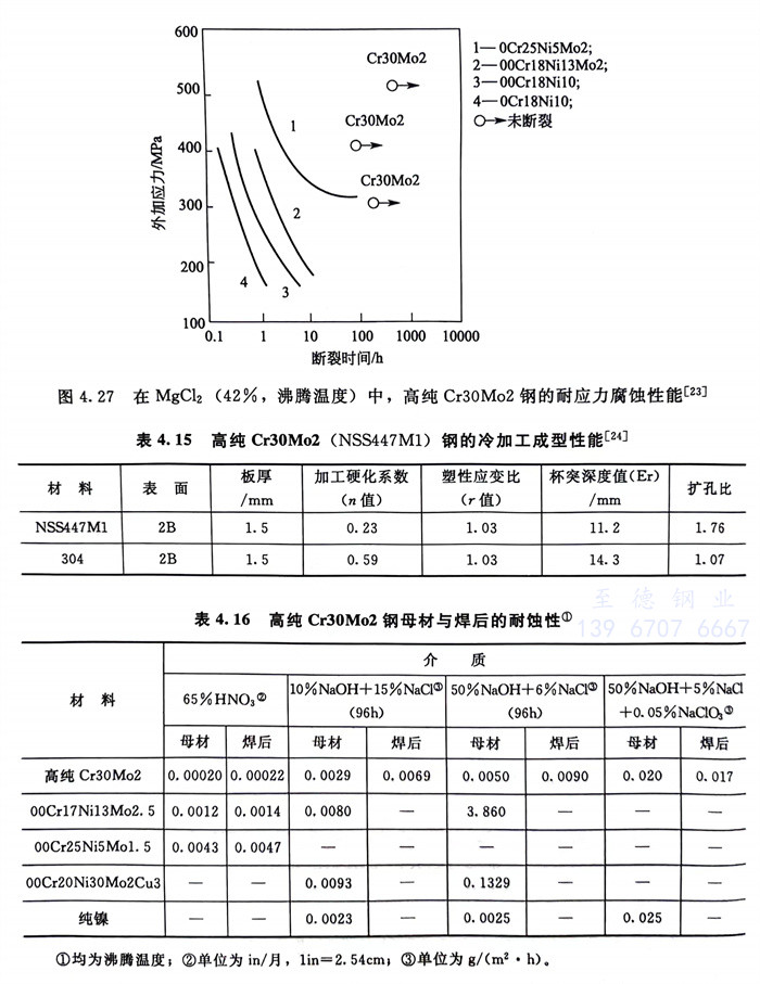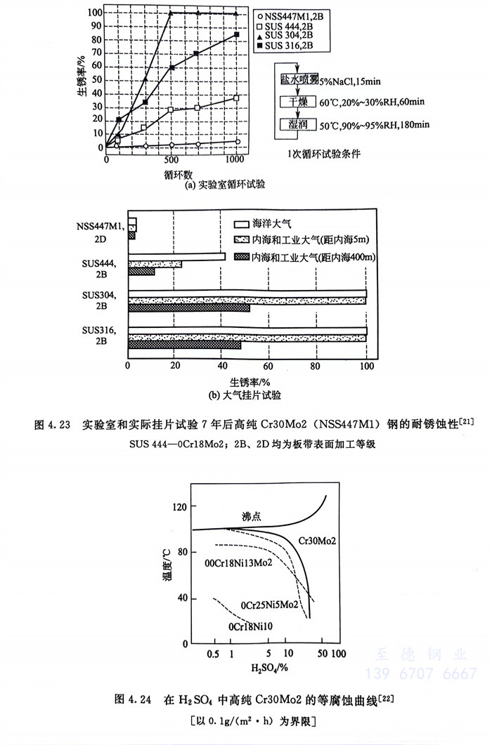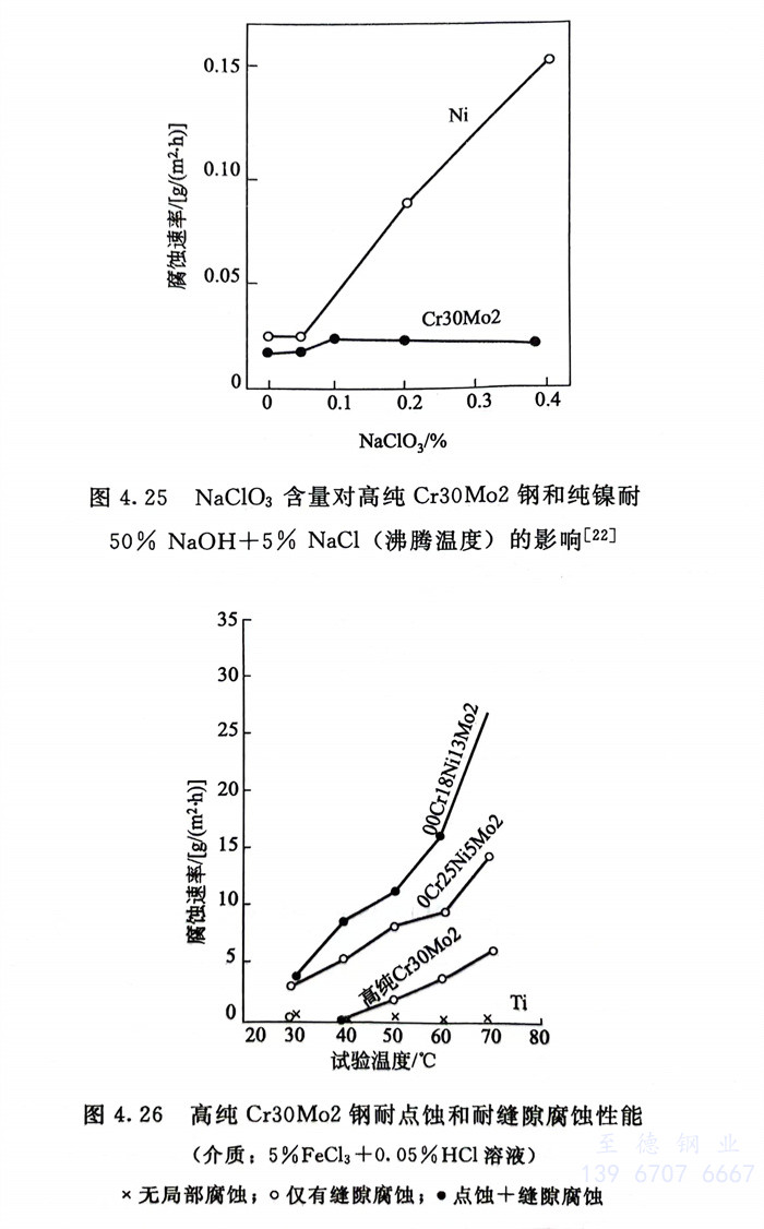 在各(ge)種大氣和各(ge)種酸(suan)、堿、鹽(yan)介(jie)質(zhi)中(zhong)(zhong),高純(chun)Cr30Mo2耐全(quan)面腐蝕和耐局部腐蝕性能(neng)均遠(yuan)遠(yuan)優于316型不銹鋼,在含(han)氧(yang)化(hua)劑的(de)NaOH中(zhong)(zhong)優于純(chun)鎳,一些(xie)試驗結果見圖4.23~圖4.27和表4.14。