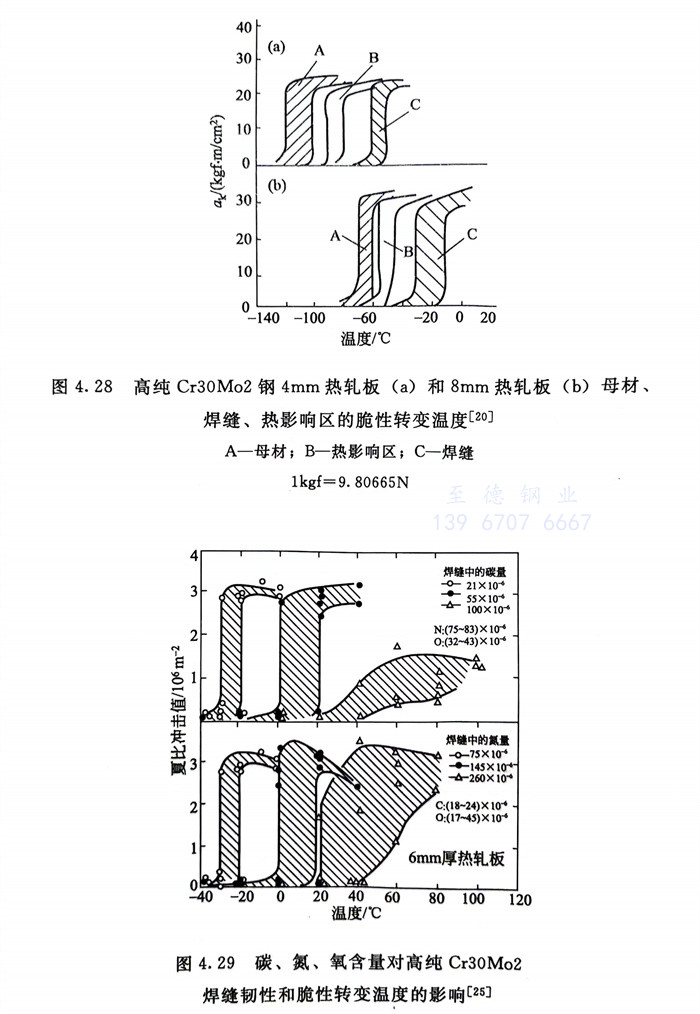 表(biao)4.15列出了高(gao)(gao)純Cr30Mo2 1.5mm板材冷成型(xing)性(xing)數(shu)據。試驗還表(biao)明,高(gao)(gao)純Cr30Mo2焊(han)接(jie)性(xing)良好,焊(han)后(hou)無晶間(jian)腐蝕(shi)傾(qing)向(xiang),在(zai)一些腐蝕(shi)介(jie)質中,焊(han)前、焊(han)后(hou)的(de)耐蝕(shi)性(xing)無明顯(xian)差別(表(biao)4.16);適宜截面尺(chi)寸的(de)高(gao)(gao)純Cr30Mo2鋼焊(han)后(hou)的(de)韌性(xing)和脆性(xing)轉變溫(wen)度完全(quan)可滿(man)足使用的(de)需求(見圖4.28);但是,在(zai)焊(han)接(jie)過程(cheng)中,要采取措施(shi)防止碳、氮(dan)等間(jian)隙(xi)元素對焊(han)縫的(de)污染。圖4.29系因(yin)焊(han)縫污染而(er)引起的(de)高(gao)(gao)純Cr30Mo2鋼焊(han)后(hou)韌性(xing)的(de)降(jiang)低和脆性(xing)轉變溫(wen)度的(de)升高(gao)(gao)。