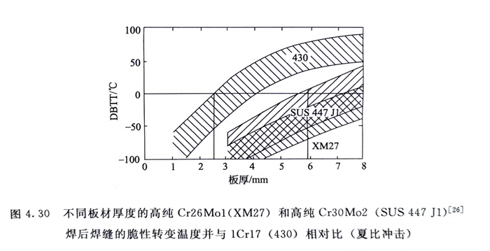 圖4.30指出了1Cr17(430)和兩種高純鐵(tie)素(su)體不銹鋼(gang)高純Cr26Mol(XM27)和高純Cr30Mo2不同厚度板材焊后焊縫的脆性轉變溫度,可以明顯看出,高純化對鐵素體不銹鋼的韌性的改善是非常顯著的,如果以攝氏零度為使用界限的話,1Cr17焊材僅能用于厚度≤2.5mm,而高純、高鉻的Cr26Mo1和Cr30Mo2則可用到6mm,若為3mm薄板,則可用到-50℃以下。