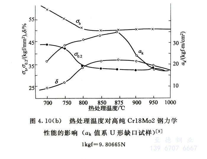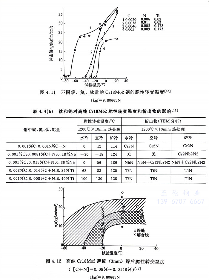 一些結果見圖(tu)4.10(b)~圖(tu)4.12。可(ke)以(yi)(yi)(yi)(yi)看出(chu),適(shi)宜的(de)熱處理可(ke)以(yi)(yi)(yi)(yi)獲(huo)得滿意(yi)的(de)塑、韌性(xing)[圖(tu)4.10(b)];盡量降低鋼(gang)中(zhong)的(de)碳、氮含量,適(shi)量的(de)鈦含量,可(ke)使此鋼(gang)的(de)脆(cui)性(xing)轉(zhuan)變(bian)溫度(du)(du)降到-20℃以(yi)(yi)(yi)(yi)下(圖(tu)4.11);在(zai)模擬焊接(jie)(jie)條(tiao)件(1200℃×10min)并以(yi)(yi)(yi)(yi)不(bu)同(tong)速(su)度(du)(du)冷卻,所試驗的(de)高(gao)純(chun)(chun)Cr18Mo2鋼(gang)中(zhong)僅含0.001%~0.002%C,但C + N含量均(jun)≤0.015%,不(bu)論是否添加穩定元素(su)Ti、Nb,只(zhi)要有(you)氮化物析出(chu),也同(tong)樣(yang)會顯著提高(gao)鋼(gang)的(de)脆(cui)性(xing)轉(zhuan)變(bian)溫度(du)(du)[表4.4(b)],而薄截面尺(chi)寸(3mm)的(de)高(gao)純(chun)(chun)Cr18Mo2的(de)焊接(jie)(jie)接(jie)(jie)頭(焊縫和熔(rong)合線(xian))脆(cui)性(xing)轉(zhuan)變(bian)溫度(du)(du)也可(ke)低于(yu)-20℃以(yi)(yi)(yi)(yi)下(圖(tu)4.12)。