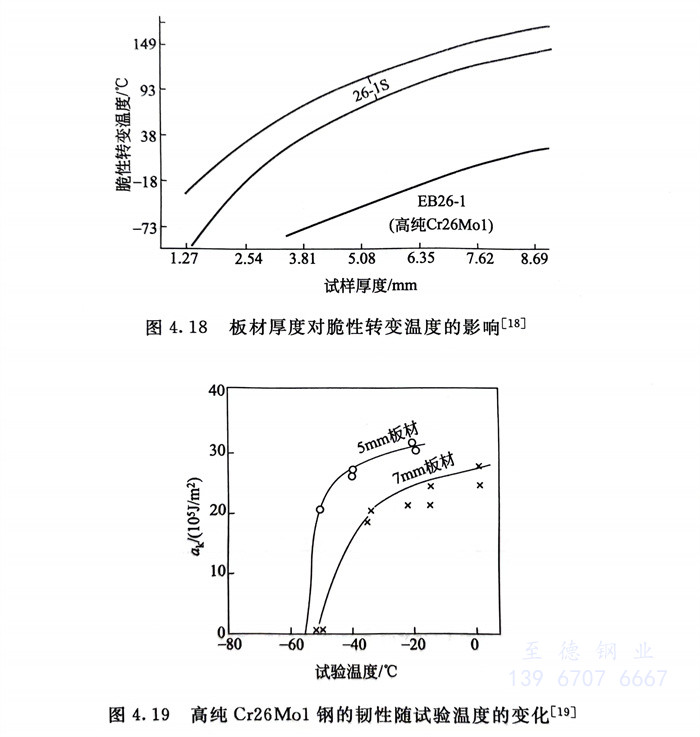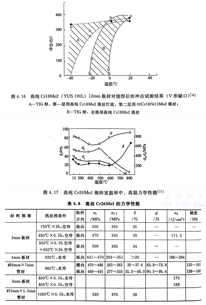 力(li)學性(xing)能(neng)見圖(tu)4.17和表4.8。脆性(xing)轉變溫度(du)見圖(tu)4.18和圖(tu)4.19。一般認(ren)為高純Cr26Mo1截面(mian)尺寸適用于≤6mm或(huo)≤7mm板、帶材(cai)、管材(cai)。
