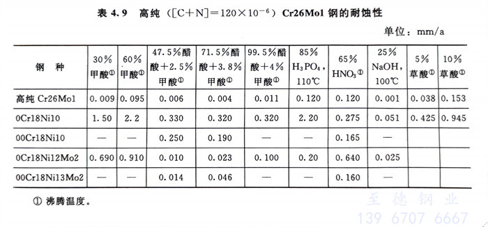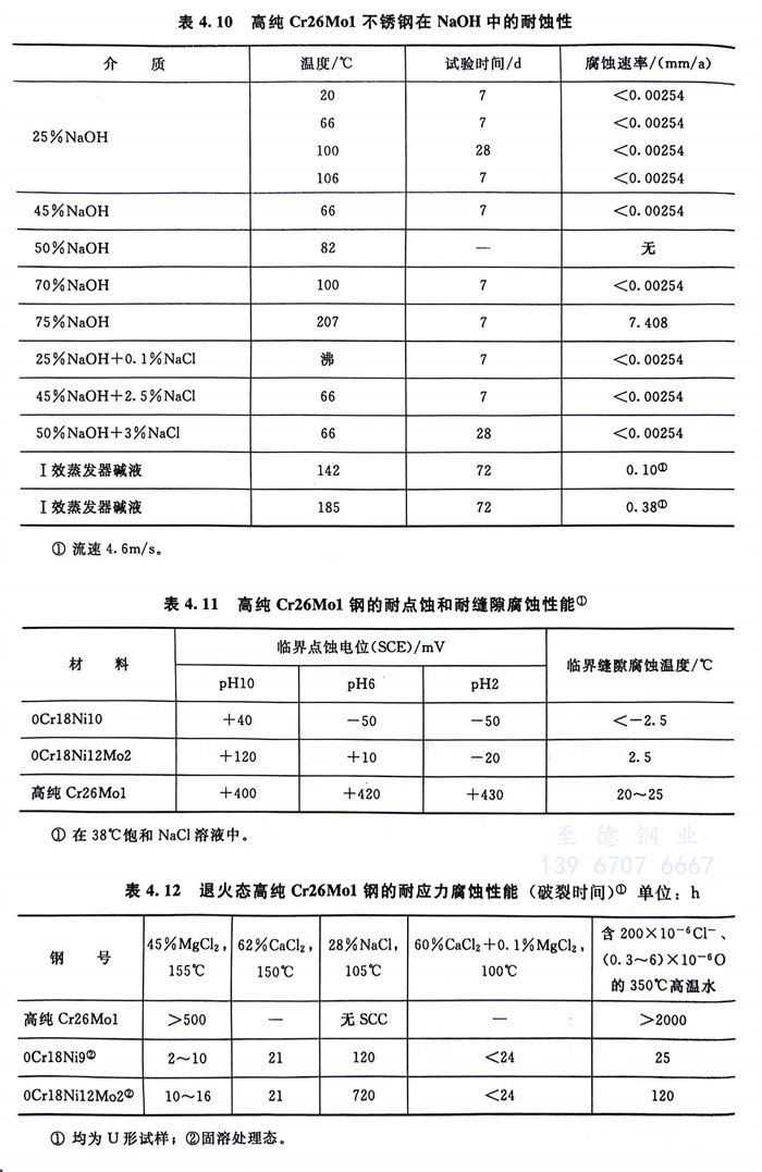 高純Cr26Mo1耐(nai)(nai)蝕(shi)(shi)性優良,即使在65%沸騰(teng)HNO3和NaOH中(zhong)亦(yi)然(ran)(見表4.9和表4.10);在耐(nai)(nai)點蝕(shi)(shi)、耐(nai)(nai)縫隙(xi)腐(fu)蝕(shi)(shi)、耐(nai)(nai)應力(li)腐(fu)蝕(shi)(shi)等局(ju)部腐(fu)蝕(shi)(shi)中(zhong)均(jun)既優于0Cr18Ni10,也優于0Cr18Ni12Mo2。一些結果見表4.11和表4.12。