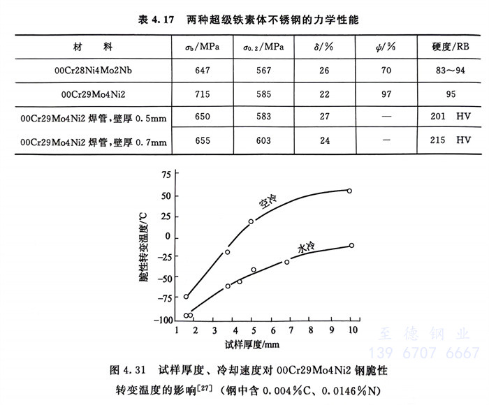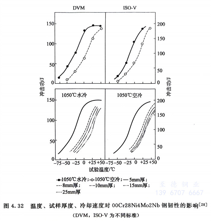 一些試驗結果見表4.17、圖4.31及圖4.32。可以看出:兩種超級鐵素體不(bu)銹鋼的韌性和脆性轉變溫度均受鋼的截面和冷卻速度的影響,在適宜的截面尺寸下,兩種鋼均具有足夠的室溫韌性和較低的脆性轉變溫度。