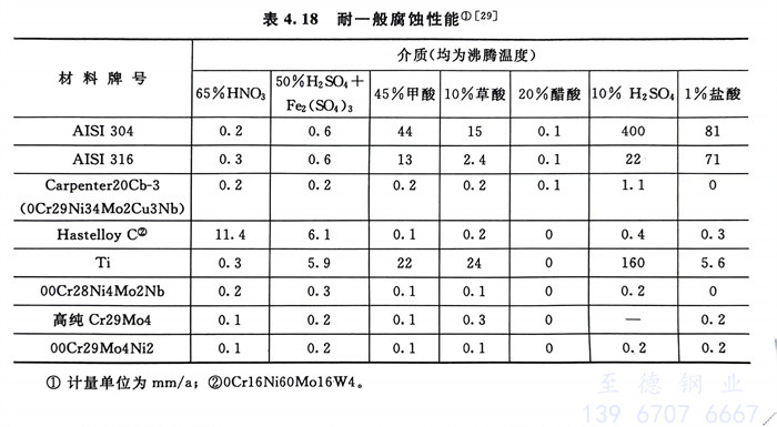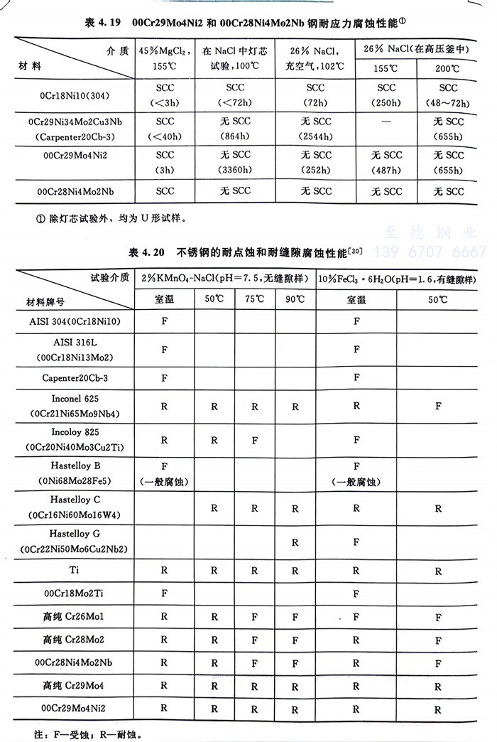 00Cr29Mo4Ni2和00Cr28Ni4Mo2Nb兩種超級鐵(tie)素體(ti)不銹鋼耐全面腐蝕、耐點蝕和縫隙腐蝕以及耐應力腐蝕的性能見表4.18~表4.20和圖4.33。
