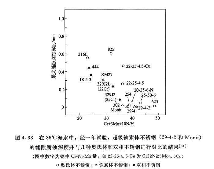 從表4.18~表4.20中的結果可看出00Cr29Mo4Ni2和00Cr28Ni4Mo2Nb具有優良的耐蝕性,在耐點蝕和縫隙腐蝕方面,00Cr29Mo4Ni2還優于00Cr28Ni4Mo2并且還超過了高鎳耐蝕合金Capenter20Cb-3(0Cr29Ni34Mo2Cu3Nb)和Inconel 625(0Cr21Ni65Mo9Nb4)。從圖4.33在實際海水中一年的試驗結果表明,超級鐵素體不銹鋼29-4-2(00Cr29Mo4Ni2),Monit(00Cr25Mo4Ni4),高純Cr30Mo2、Cr29Mo4(圖中302和29-4)均優于所有高牌號的奧氏體不銹鋼,且與超級奧氏體不銹鋼,如254 SMO(圖中254),00Cr20Ni25Mo6N(圖中20-25-6-N)以及高鎳耐蝕合金00Cr21Ni65Mo9Nb4(圖中625)相比,耐蝕性也相同或稍優。
