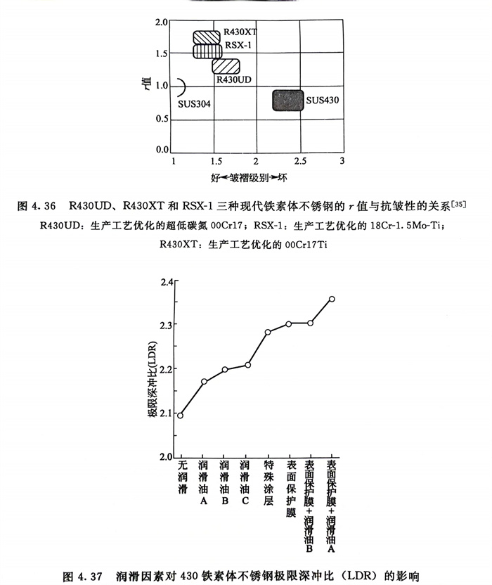 表4.23列出了(le)1Cr17、00Cr17Ti、00Cr17CuNb和(he) 1Cr18Mo1.5Ti、00Cr18Mo1.5Ti鋼(gang)的(de)(de)冷(leng)成(cheng)(cheng)型(xing)性(xing)(xing)參數。圖4.36還給出了(le)這幾種鋼(gang)的(de)(de)r值和(he)抗皺性(xing)(xing)的(de)(de)關系中所(suo)處的(de)(de)位置。研究表明,為了(le)提高鐵(tie)素體不銹鋼(gang)的(de)(de)深沖性(xing)(xing),除材料本身的(de)(de)性(xing)(xing)能外(wai),冷(leng)成(cheng)(cheng)型(xing)時(shi)的(de)(de)潤滑(hua)條件也(ye)有(you)很(hen)大(da)的(de)(de)影(ying)響(圖4.37)。由于00Cr18Mo1.5Ti鋼(gang)具有(you)優異的(de)(de)冷(leng)成(cheng)(cheng)型(xing)性(xing)(xing),國(guo)外(wai)已制成(cheng)(cheng)(深沖)具有(you)凹凸復雜(za)形狀的(de)(de)汽車燃油(you)箱。