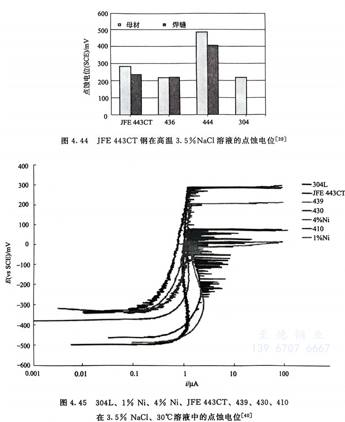 JFE 443CT鋼(00Cr21CuTi)的耐(nai)點(dian)(dian)蝕(shi)(shi)和耐(nai)縫隙腐蝕(shi)(shi)性(xing)(xing)能(neng) 圖4.43~圖4.46系國(guo)內(nei)外耐(nai)點(dian)(dian)蝕(shi)(shi)性(xing)(xing)的一些(xie)(xie)試(shi)驗結(jie)果。從這(zhe)些(xie)(xie)試(shi)驗結(jie)果可(ke)看出(chu)(chu),在(zai)所有(you)試(shi)驗條件下00Cr21CuTi鋼的耐(nai)點(dian)(dian)蝕(shi)(shi)性(xing)(xing)與(yu)SUS304鋼相(xiang)當。圖4.45國(guo)內(nei)的結(jie)果還指出(chu)(chu)了目前國(guo)內(nei)市場上宣(xuan)傳(chuan)能(neng)替(ti)代SUS304鋼并大量(liang)生產(chan)和銷售的含1%Ni、4%Ni且低(di)銘且高錳量(liang)的所謂“200系”鋼①,耐(nai)點(dian)(dian)蝕(shi)(shi)性(xing)(xing)能(neng)很差(cha),1%Ni(0Cr15Ni1Mn10CuN)低(di)于(yu)410 (0Cr12),4%Ni(0Cr15Ni4Mn8Cu)低(di)于(yu)430(0Cr17)。