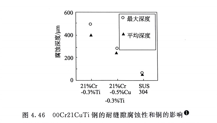 JFE所(suo)進行的(de)JFE 443CT耐(nai)縫(feng)隙(xi)腐(fu)蝕(shi)的(de)試驗結果見圖4.46中,一方面表(biao)明(ming)在相(xiang)同試驗條件下,含0.5%Cu的(de)00Cr21Cu0.5Ti(JFE 443CT)較不(bu)含銅者耐(nai)縫(feng)隙(xi)腐(fu)蝕(shi)性顯(xian)著提(ti)高,但也指出,00Cr21Cu0.5Ti(JFE 443CT)鋼的(de)耐(nai)縫(feng)隙(xi)腐(fu)蝕(shi)性要低于(yu)SUS 304,也說(shuo)明(ming)了(le)鎳在不(bu)銹鋼中耐(nai)縫(feng)隙(xi)腐(fu)蝕(shi)性能的(de)良好作用。