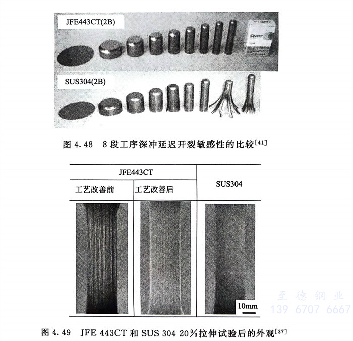圖(tu)4.47 443、439和(he)304以及(ji)1%Ni、4%Ni鋼(gang)(gang)延(yan)遲(chi)斷(duan)裂(lie)(lie)敏感(gan)(gan)性(xing) ,圖(tu)4.48則系一種產品分8段進行深沖(chong)加(jia)(jia)工(gong),深沖(chong)比達(da)5~6高應變(bian)條件(jian)下的(de)試驗結果。可以看出JFE443CT鋼(gang)(gang)并未出現延(yan)遲(chi)開(kai)(kai)裂(lie)(lie)而(er)SUS 304不銹鋼(gang)(gang)在第(di)7段冷加(jia)(jia)工(gong)后(hou)便出現了開(kai)(kai)裂(lie)(lie)。說明(ming)了SUS 304鋼(gang)(gang)的(de)延(yan)遲(chi)斷(duan)裂(lie)(lie)敏感(gan)(gan)性(xing)要(yao)高于JFE 443CT鋼(gang)(gang),一般認為奧氏體不銹鋼(gang)(gang)延(yan)遲(chi)開(kai)(kai)裂(lie)(lie)敏感(gan)(gan)性(xing)高的(de)原(yuan)因與冷加(jia)(jia)工(gong)大變(bian)形區(qu)域的(de)延(yan)伸還(huan)存在二(er)次硬化和(he)二(er)次加(jia)(jia)工(gong)脆(cui)化有(you)關。