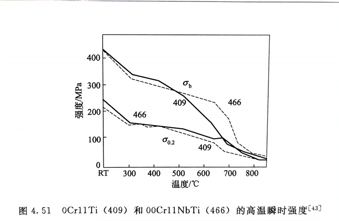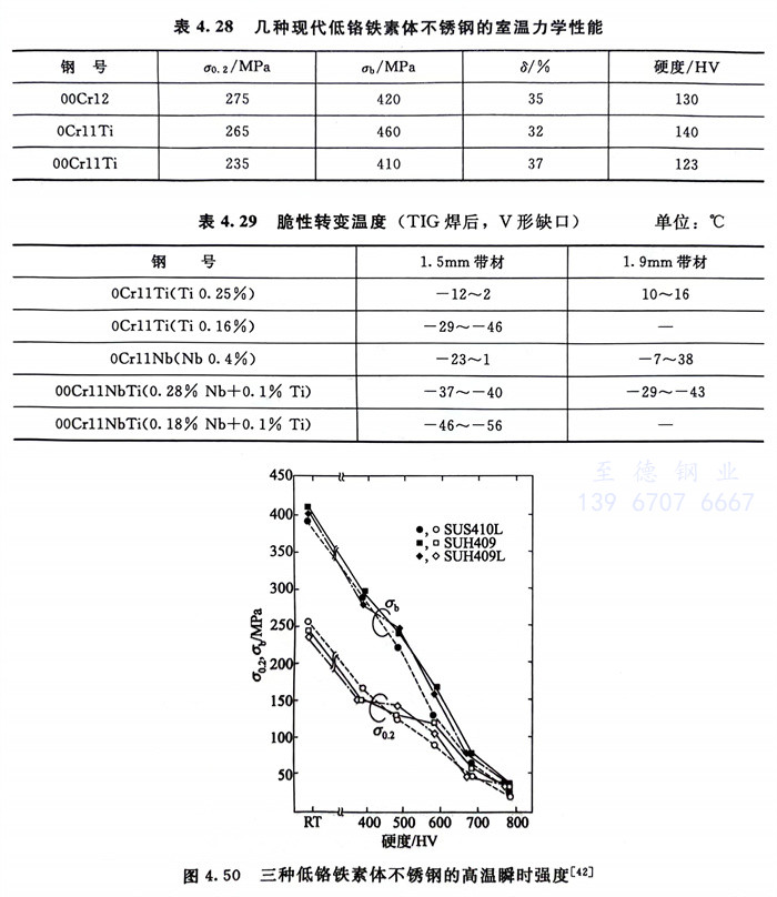 幾種(zhong)現代低(di)鉻鐵素體不(bu)銹鋼的室溫(wen)、高溫(wen)力(li)學性能和(he)(he)(he)脆性轉變溫(wen)度見表4.28和(he)(he)(he)表4.29,以(yi)及圖4.50和(he)(he)(he)圖4.51。從表4.29的結果可看出,用Ti、Nb雙穩定化的00Cr11NbTi(466)有最低(di)的脆性轉變溫(wen)度。