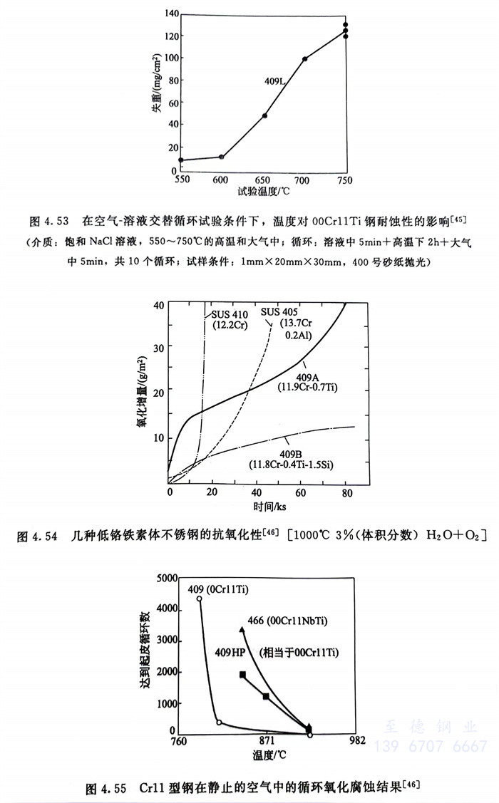 由于(yu)現(xian)代低(di)鉻(ge)鐵(tie)素(su)體(ti)不銹鋼大(da)量用(yong)作汽車(che)排氣系統構件,因而在(zai)模擬汽車(che)冷凝中進(jin)行(xing)了大(da)量試驗。圖4.52和圖4.53系一(yi)些試驗結(jie)果(guo)。模擬汽車(che)的使用(yong)條件,還在(zai)大(da)氣中進(jin)行(xing)了抗氧化試驗和空氣與溶液循環交替條件下的試驗,結(jie)果(guo)見圖4.54和圖4.55。為(wei)了防止晶間腐(fu)蝕(shi),在(zai)汽車(che)構件中使用(yong)的所有(you)(you)現(xian)代低(di)鉻(ge)鐵(tie)素(su)體(ti)不銹鋼均含有(you)(you)穩定(ding)化元素(su)。