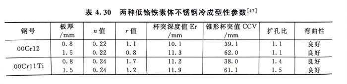 現代低(di)鉻鐵(tie)素體(ti)不(bu)銹(xiu)鋼(gang)由于鉻量低(di)且低(di)碳、超低(di)碳,加之很多牌號又(you)含鈦、鈮,因(yin)而冷成型(xing)性(xing)和焊接性(xing)均優良(liang)。表4.30列出了兩種現代鐵(tie)素體(ti)不(bu)銹(xiu)鋼(gang)的冷成型(xing)性(xing)參數。