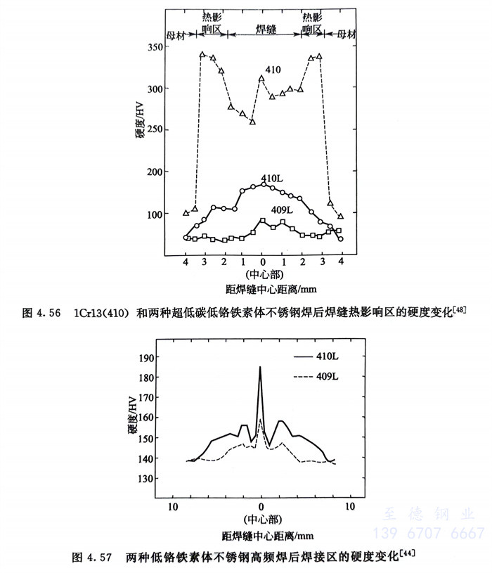 現代低鉻鐵素體(ti)不銹(xiu)鋼的(de)焊(han)(han)接性在(zai)鐵素體(ti)不銹(xiu)鋼中(zhong)最佳,焊(han)(han)后沒(mei)有熱裂(lie)傾(qing)向(xiang)和晶間腐蝕的(de)敏感(gan)性,超低碳低鉻鐵素體(ti)不銹(xiu)鋼焊(han)(han)后熱影響區硬度無(wu)明顯(xian)變化〔見圖(tu)4.56和圖(tu)4.57),焊(han)(han)后韌性可滿足使用需求。表4.31列出了高頻焊(han)(han)管(guan)的(de)力學性能(neng)和壓(ya)扁、擴口的(de)結果。