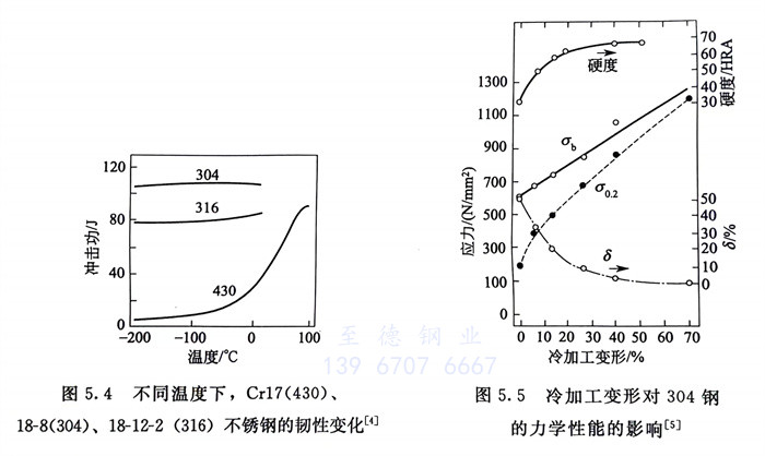 由于18-8鋼冷、熱加工性優良,它可順利地生產各種冶金產品,如板、管、絲、帶、型材(包括異型材)等,且力學性能優良(表5.2),特別是具有優異的塑、韌性。由于沒有脆性轉變溫度(圖5.4),18-8鋼也是常用的低溫不銹鋼之一。通過冷作硬化,06Cr19Ni10的強度可有明顯提高(圖5.5)。隨冷變形量增加,鋼的硬度增加,伸長率降低,這與冷加工變形量的增加,形變馬氏體的大量形成有關。