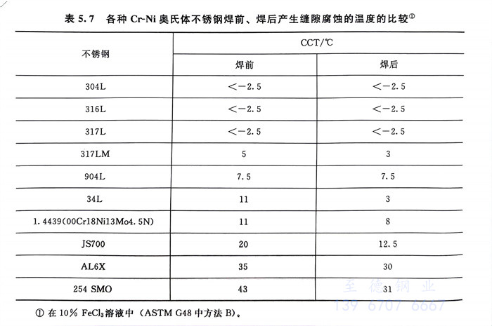圖5.17和(he)(he)表5.7系超級(ji)奧(ao)氏體(ti)不(bu)銹鋼(gang)(gang)的(de)耐點(dian)蝕(shi)(shi)和(he)(he)耐縫(feng)隙(xi)腐(fu)蝕(shi)(shi)性(xing)能與各種(zhong)鉻(ge)鎳奧(ao)氏體(ti)不(bu)銹鋼(gang)(gang)性(xing)能的(de)比較。可(ke)(ke)以(yi)看出(chu),超級(ji)奧(ao)氏體(ti)不(bu)銹鋼(gang)(gang)254 SMO和(he)(he)AL 6XN 性(xing)能最佳。從圖5.17中還(huan)可(ke)(ke)看出(chu),相同PRE值(zhi)條件下,臨界點(dian)蝕(shi)(shi)和(he)(he)臨界縫(feng)隙(xi)腐(fu)蝕(shi)(shi)的(de)溫度間相差(cha)較大且隨PRE值(zhi)的(de)增加(jia)還(huan)有(you)進一步(bu)拉大的(de)趨勢,這充分說明,從合金化入手解決(jue)不(bu)銹鋼(gang)(gang)耐縫(feng)隙(xi)腐(fu)蝕(shi)(shi)的(de)難度要遠(yuan)遠(yuan)大于解決(jue)耐點(dian)腐(fu)蝕(shi)(shi)的(de)難度。因此,從結構設計(ji)和(he)(he)應(ying)用過程中避(bi)免產生縫(feng)隙(xi)入手解決(jue)縫(feng)隙(xi)腐(fu)蝕(shi)(shi)的(de)問題是最佳途徑,需要予以(yi)重視。
