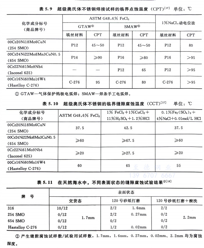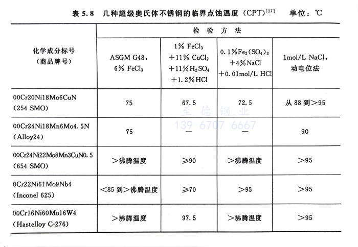 表5.8~表5.10系在一(yi)些試驗條(tiao)件下(xia),幾種(zhong)超級奧氏體不(bu)銹鋼與知名(ming)高鎳(鎳基)耐蝕(shi)(shi)合金 Inconel 625(0Cr22Ni61Mo9Nb4)和(he) Hastelloy C-276 (00Cr16Ni6cMo16W4)耐點蝕(shi)(shi)、耐縫隙(xi)腐蝕(shi)(shi)性能的比較(jiao)。