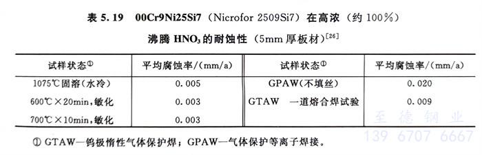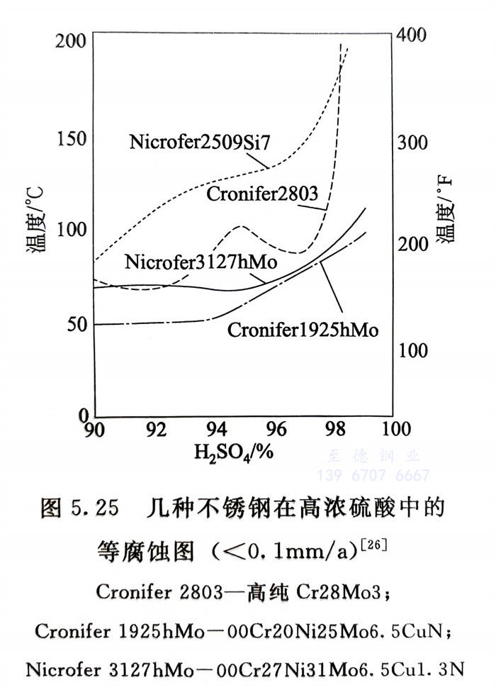 此鋼的力學性能、耐蝕性、冷成型性和焊接性等與前述00Cr19Ni25Si7鋼有許多類似之處。此鋼具有良好的耐高溫、高濃度硫酸腐蝕性能,高塑性,較好的冷成型性;但焊接性能也較差,必須采用激光焊且焊后需固溶處理,才能保證鋼的綜合性能。圖5.26系此鋼在≥90%H2SO,中的耐蝕性。