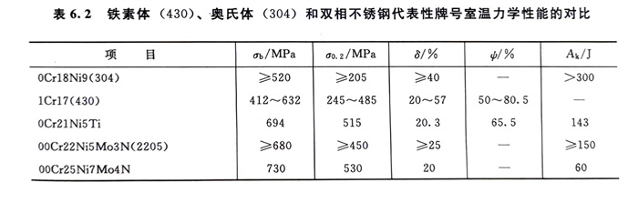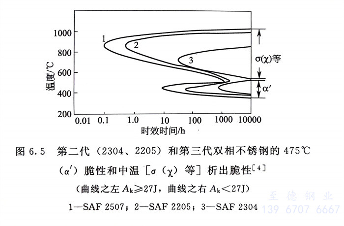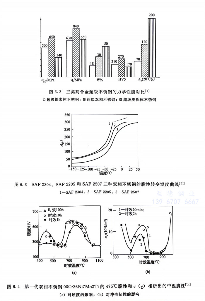 高強度,存在脆性轉變溫度和三個脆性區。由于雙相不銹鋼(gang)具有微細的顯微組織以及鉬、氮等的強化作用,雙相不銹鋼的強度遠遠高于鐵素體不銹鋼和奧氏體不銹鋼,一些試驗結果見表6.2和圖6.2。但是,雙相不銹鋼中含高鉻、鉬的大量鐵素體相的存在,使得鐵素體不銹鋼中所具有的脆性轉變溫度和475℃脆性、中溫脆性以及高溫脆性三個脆性區的特征,在雙相不銹鋼中也顯現了出來(圖6.3~圖6.5系475℃和中溫脆性的情況)。但是由于雙相不銹鋼的晶粒細化且又存在大量奧氏體,所以雙相不銹鋼的脆性轉變溫度明顯低于普通鐵素體不銹鋼,一般均在-40℃或一50℃以下,而且室溫沖擊韌性也足夠高(表6.2),因此并不影響雙相不銹鋼的工程應用。至于475℃脆性和中溫脆性只要不高于260℃,長期使用就不會有任何危險。