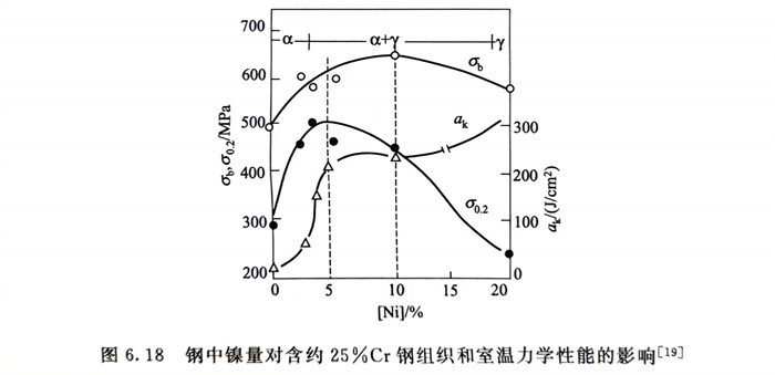 圖6.18系浙江至德鋼業有限公司試驗取得的結果。在含25%Cr雙相不銹(xiu)鋼管的情況下,加入不同鎳量,調整不同的鉻當量/鎳當量以獲得不同的相比例并測定了它們的力學性能。可以看出,隨鋼中鎳量的增加,此鋼從單相鐵素體向α+γ雙相組織過渡,當含鎳量約達18%時,又基本上系單相奧氏體。在雙相區內,當含鎳量在約5%時,鋼的屈服強度達到最高值,此時的a/γ比例并不到1:1,鎳量再增加,y量加大,則屈服強度明顯下降;當含鎳量約達10%,此時γ量已超過50%,鋼的抗拉強度達到最高值,隨后稍有下降;而鋼的沖擊韌性值則隨鎳量增加、γ相量的增多而提高,達單一奧氏體組織時,此鋼具有最高的沖擊韌性值。