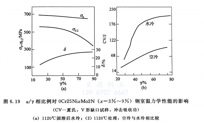 圖(tu)(tu)6.19系含(han)3%~9%Ni的(de)(de)(de)0Cr25NixMo2N雙相不(bu)(bu)銹(xiu)鋼(gang)(gang)管(guan),經不(bu)(bu)同固(gu)溶(rong)處理(li)后的(de)(de)(de)相比例對鋼(gang)(gang)的(de)(de)(de)力學性(xing)能(neng)的(de)(de)(de)影(ying)響。可以看出,隨γ奧氏體量增加,屈服強度明(ming)顯(xian)下降,而(er)伸長率和沖(chong)擊功則明(ming)顯(xian)上升,此結果(guo)與(yu)圖(tu)(tu)6.18的(de)(de)(de)結果(guo)基(ji)本(ben)一(yi)致。圖(tu)(tu)中冷(leng)(leng)卻速(su)度(水冷(leng)(leng)、空冷(leng)(leng))不(bu)(bu)同,鋼(gang)(gang)的(de)(de)(de)沖(chong)擊功差別(bie)較大,這顯(xian)示了鋼(gang)(gang)中鐵素體的(de)(de)(de)存(cun)在,碳、氮化物(wu)析出的(de)(de)(de)影(ying)響。