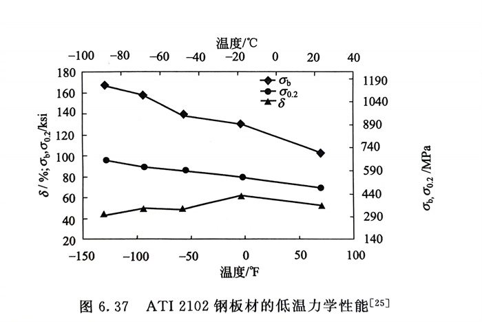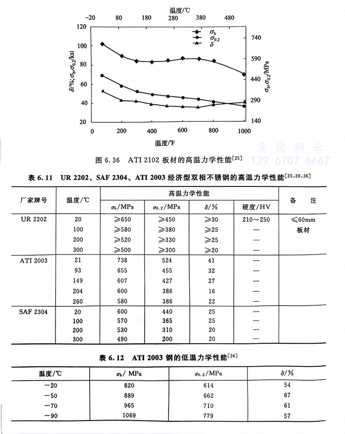 幾種經濟型雙相(xiang)不銹鋼的高溫力學性能見圖6.36和表6.11,低溫力學性能見圖6.37和表6.12。
