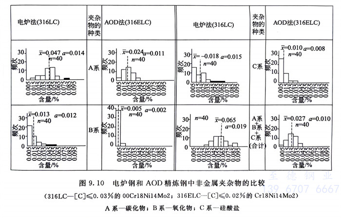 表(biao)9.6列(lie)出了(le)國內(nei)用電爐和VOD精煉的(de)1Cr18Ni9Ti鋼(gang)中非金屬(shu)夾雜物的(de)比較。同樣,VOD精煉的(de)1Cr18Ni9Ti純凈度(du)較電爐鋼(gang)為高。