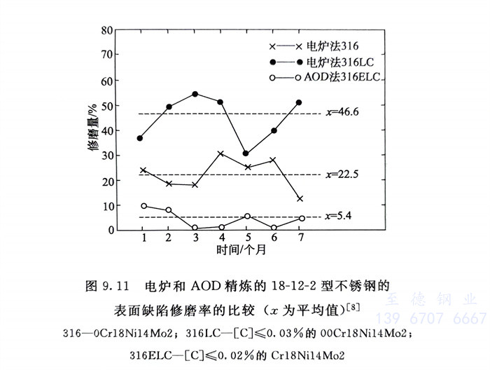 圖9.11系電爐鋼和(he)AOD二(er)次精(jing)煉鋼修(xiu)磨率(lv)的(de)對比,顯然AOD精(jing)煉鋼修(xiu)磨率(lv)低于電爐鋼。