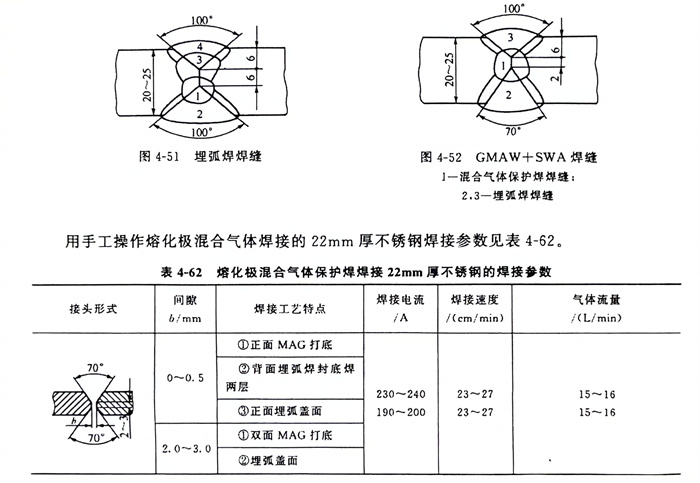 用(yong)手工操作(zuo)熔化極(ji)混合(he)氣(qi)體焊接的22mm厚不銹鋼(gang)焊接參數(shu)見表4-62。