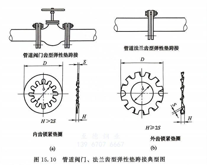 ①. 管道通(tong)過法(fa)蘭連(lian)(lian)(lian)(lian)接(jie)、焊(han)接(jie)和(he)螺(luo)紋連(lian)(lian)(lian)(lian)接(jie)等方式與(yu)設備(bei)相連(lian)(lian)(lian)(lian),對于法(fa)蘭連(lian)(lian)(lian)(lian)接(jie),一般情況下是法(fa)蘭通(tong)過螺(luo)栓(shuan)、螺(luo)母的(de)連(lian)(lian)(lian)(lian)接(jie)可將靜電導(dao)走(zou),并不(bu)需要另做法(fa)蘭跨(kua)接(jie)線設計。在螺(luo)栓(shuan)連(lian)(lian)(lian)(lian)接(jie)處,如果(guo)導(dao)電效(xiao)果(guo)不(bu)良時,可在法(fa)蘭螺(luo)栓(shuan)上增(zeng)設金屬齒型(xing)墊(dian)片(pian)的(de)方法(fa)加以解決,見(jian)圖15.10。