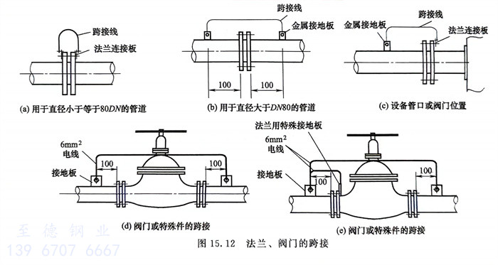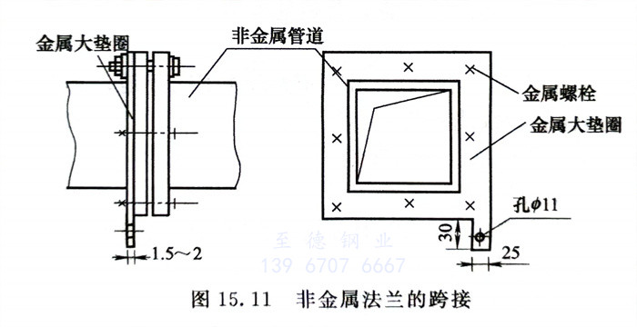 ④. 塑(su)料等非(fei)金(jin)(jin)屬法蘭(lan)用(yong)金(jin)(jin)屬螺(luo)栓緊固連(lian)接,可加金(jin)(jin)屬大(da)墊圈,使(shi)所有(you)螺(luo)栓均相接在一起,然后再引出去接地。跨接示意圖見圖15.11。