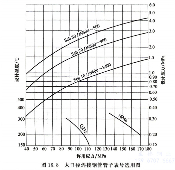 此種表示方法以ASME B36.10《焊接和無縫鋼管》為代表并為其他許多標準所采用,常以“Sch”標示。管子表號是管子設計壓力與設計溫度下材料許用應力的比值乘以1000,并經圓整后的數值。ASME B36.10和JIS標準中,管子表號有:Sch10、Sch20、Sch30、Sch40、Sch60、Sch80、Sch100、Sch120、Sch140、Sch160;ASME B36.19中不銹鋼管管子表號有:5S、10S、40S、80S;中國石化集團公司標準SH3405中,無縫鋼管采用了Sch20、Sch30、Sch40、Sch60、Sch80、Sch100、Sch120、Sch140、Sch160共9個,不銹鋼管采用了Sch5S、Sch10S、20S、40S、80S共5個。無縫鋼管和焊接鋼管的管子表號可分別查圖16.7和圖16.8確定。