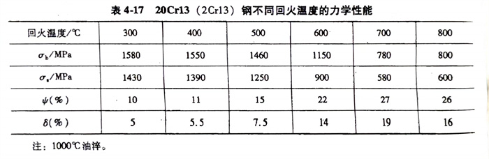 表4-17 20Cr13(2Cr13)420不銹鋼不同回火溫度的力學性能