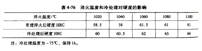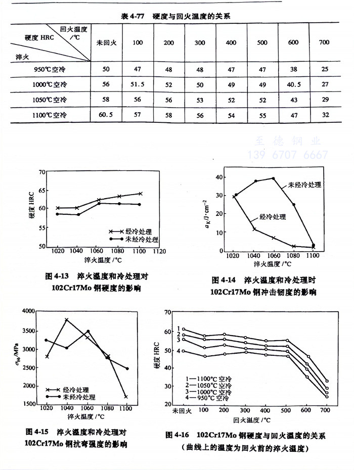 淬(cui)火(huo)溫(wen)度和(he)冷(leng)處理對(dui)硬度的影(ying)響(xiang)見(jian)表4-76和(he)圖(tu)4-13,對(dui)沖擊(ji)韌度和(he)抗(kang)彎強度的影(ying)響(xiang)見(jian)圖(tu)4-14和(he)圖(tu)4-15;硬度和(he)回火(huo)溫(wen)度的關(guan)系見(jian)表4-77和(he)圖(tu)4-16。