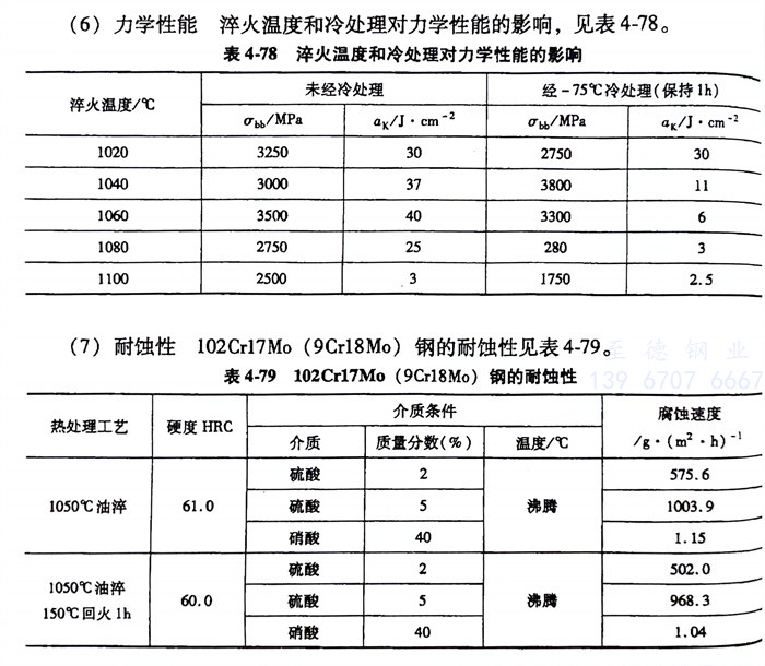 102Cr17Mo (9Cr18Mo)1.4125、440C不銹鋼淬火溫(wen)度和冷處理對(dui)力學(xue)性能的(de)影(ying)響,見表4-78。