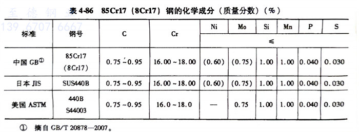 85Cr17(8Cr17)、S44003、SUS440B不銹鋼的化學成分見表4-86。