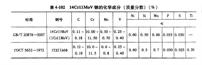 14Cr11MoV(1Cr11MoV)不銹(xiu)鋼的化學成分見表4-102。