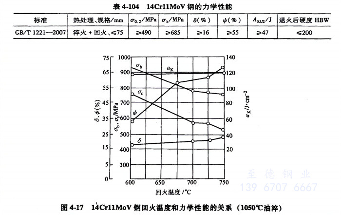 14Cr11MoV(1Cr11MoV)不(bu)銹鋼的力學性能見表4-104,14Cr11MoV鋼回(hui)火溫(wen)度和力學性能的關(guan)系見圖(tu)4-17。