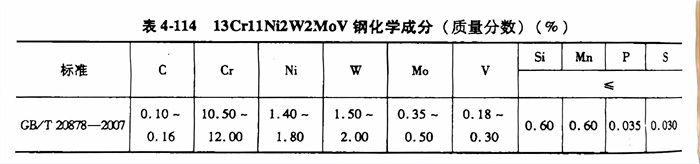 13Crl1Ni2W2MoV(1Cr11Ni2W2MoV)不銹鋼(gang)的(de)化學成分見(jian)表4-114。