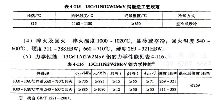 13Crl1Ni2W2MoV(1Cr11Ni2W2MoV)不銹鋼的(de)鍛造工藝規范(fan)見(jian)表(biao)4-115。