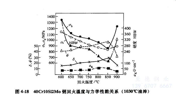 40Cr10Si2Mo(4Cr10Si2Mo)不銹鋼淬火回火后的力學性能見(jian)表4-134和圖4-18。