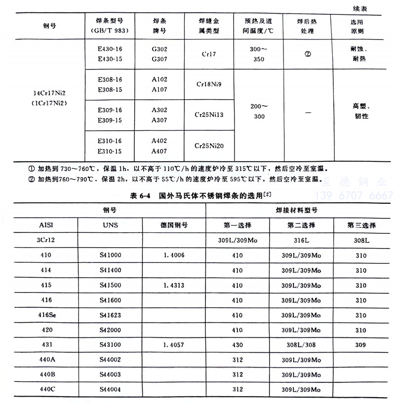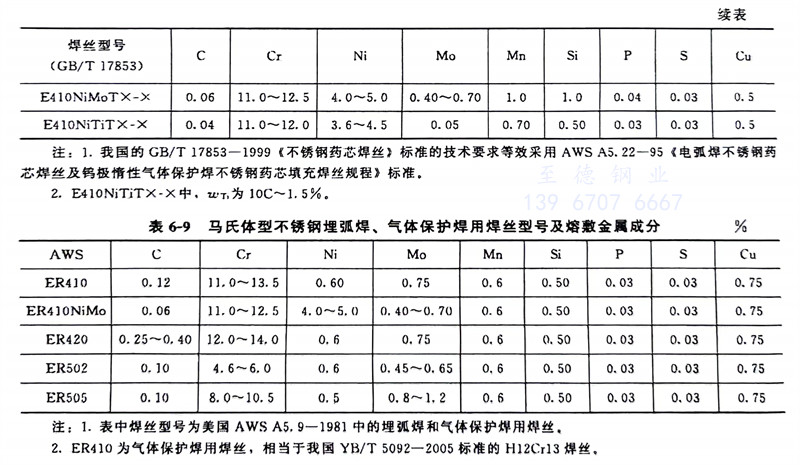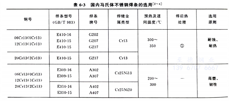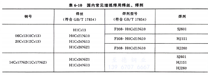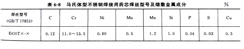該焊(han)(han)接(jie)(jie)方法(fa)焊(han)(han)接(jie)(jie)質量較好,常(chang)用于薄板焊(han)(han)接(jie)(jie)或(huo)多層焊(han)(han)打底焊(han)(han)。電極極性采用直流正接(jie)(jie)。由(you)于裂紋傾向(xiang)小(xiao),薄板焊(han)(han)前(qian)(qian)可(ke)不(bu)預(yu)熱,厚板焊(han)(han)前(qian)(qian)需預(yu)熱到120~200℃。一般選用與(yu)母材成分和組織相近的焊(han)(han)絲(si),以保證與(yu)母材匹(pi)配。國內馬氏體型不(bu)銹(xiu)鋼(gang)焊(han)(han)絲(si)選用見表6-6,國外常(chang)見馬氏體型不(bu)銹(xiu)鋼(gang)焊(han)(han)絲(si)選用見表6-7。