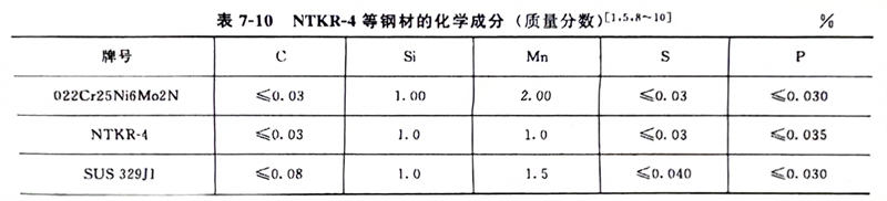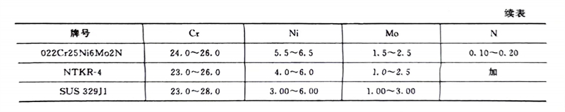 022Cr26Ni5Mo2N、SUS 329J1 雙相不銹(xiu)鋼的(de)耐腐蝕疲勞性能遠比316L(尿素(su)級)鋼好(hao),這對在低應力(li)、低頻率交(jiao)變(bian)載荷條件下工作(zuo)的(de)尿素(su)甲(jia)銨泵(beng)泵(beng)體選(xuan)材有重要的(de)參考價(jia)值。為了便于比對,將(jiang)中國(guo)的(de)022Cr26Ni6Mo2N,日(ri)本的(de)SUS 329J1、NTKR-4等雙相不銹(xiu)鋼化(hua)學成分,列(lie)入(ru)表7-10中。