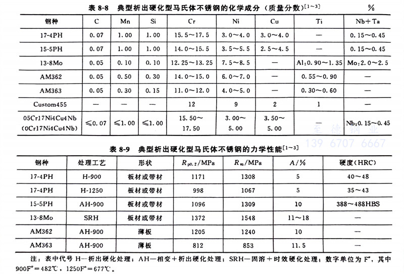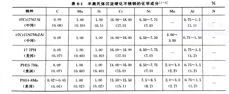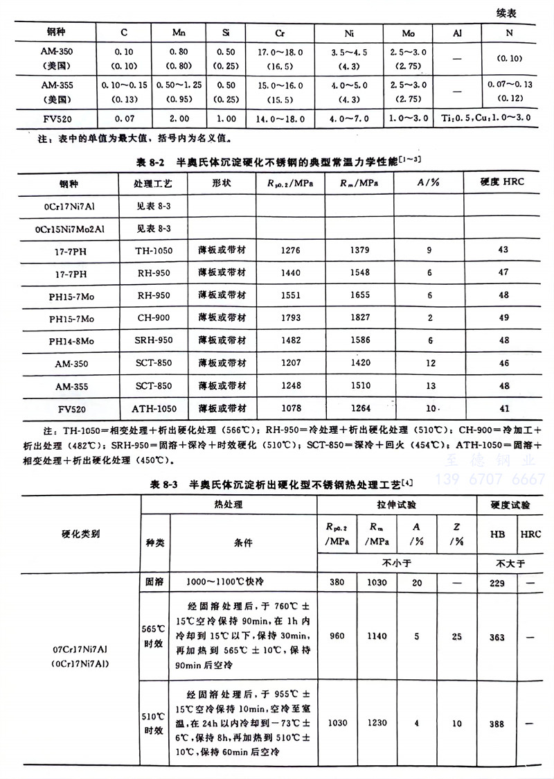 常(chang)見(jian)(jian)的半奧(ao)氏體沉淀硬(ying)化(hua)不(bu)銹鋼的化(hua)學(xue)成分、力學(xue)性能分別見(jian)(jian)表8-1~表8-3。