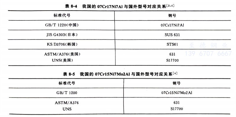 我國(guo)的07Cr17Ni7A1與國(guo)外型號對應關系見表8-4,我國(guo)的07Cr15Ni7Mo2Al與國(guo)外型號對應關系見表8-5。