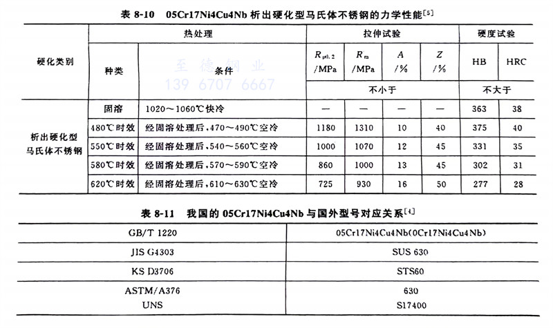 由于馬(ma)(ma)(ma)氏體沉(chen)淀硬(ying)化(hua)和時(shi)效硬(ying)化(hua)均為(wei)析(xi)出(chu)硬(ying)化(hua),故此(ci)類(lei)鋼(gang)又稱為(wei)析(xi)出(chu)硬(ying)化(hua)型(xing)馬(ma)(ma)(ma)氏體不銹鋼(gang)。這類(lei)鋼(gang)含有(you)在馬(ma)(ma)(ma)氏體中固溶度小的(de)(de)Cu、Al、Mo、Ti、Nb等強(qiang)化(hua)元(yuan)素,經低溫回火后即(ji)可(ke)達到時(shi)效強(qiang)化(hua)的(de)(de)效果。常見(jian)馬(ma)(ma)(ma)氏體沉(chen)淀硬(ying)化(hua)型(xing)不銹鋼(gang)的(de)(de)化(hua)學(xue)成分見(jian)表(biao)(biao)8-8、力學(xue)性能見(jian)表(biao)(biao)8-9、表(biao)(biao)8-10。我國的(de)(de)05Cr17Ni4Cu4Nb與(yu)國外型(xing)號(hao)對應關系見(jian)表(biao)(biao)8-11。