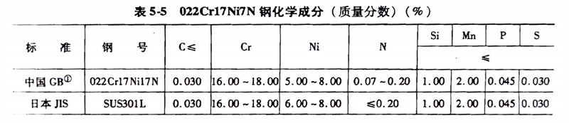 (1)化學成分: 022Cr17Ni7N、301L不(bu)銹(xiu)鋼的化學成分(fen)見表(biao)5-5。