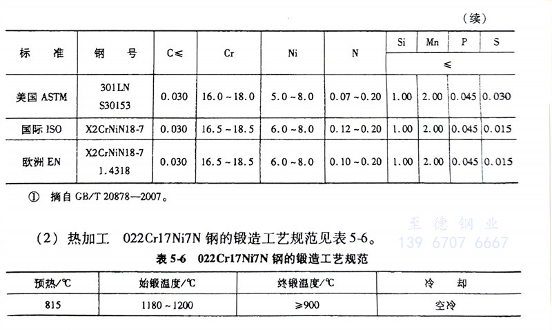 (2)熱加工: 022Cr17Ni7N、301L不銹鋼的鍛造工藝規范見表5-6。