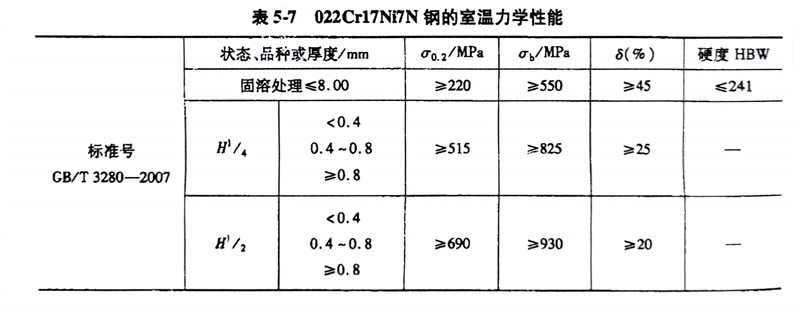 (5)力學(xue)性能: 022Cr17Ni7N、301L不(bu)銹鋼的室溫力學性能見表5-7。