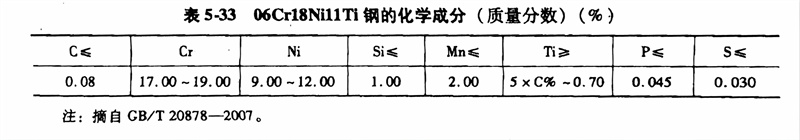 (1)化學(xue)成分(fen): 06Cr18Ni11Ti 、0Cr18Ni10Ti、321不銹鋼(gang)的化學成分見表5-33。